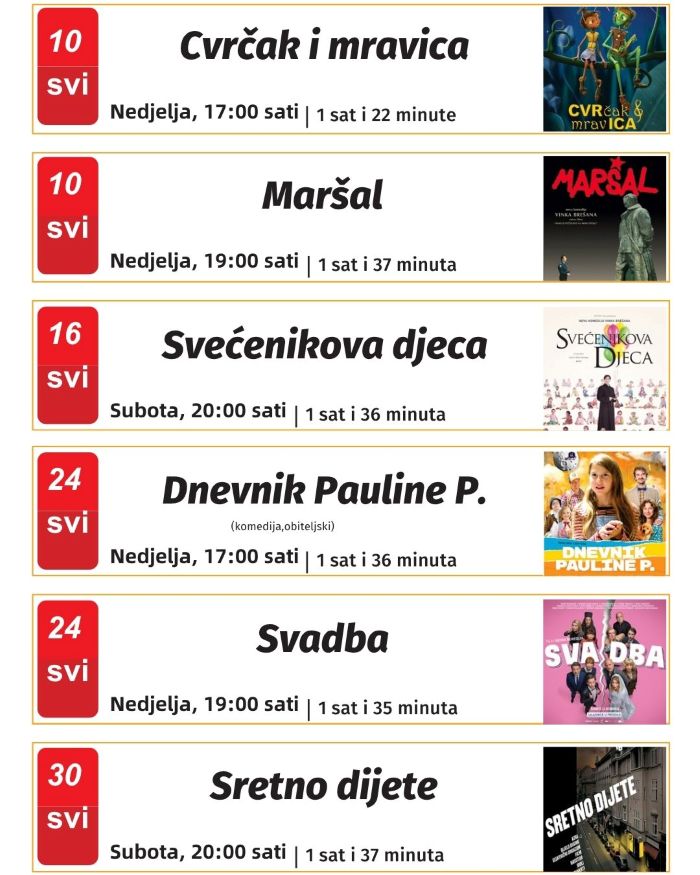 U ludbreškom kinu povodom Mjeseca našeg možete pogledati pet odabranih naslova. Cijena ulaznica za filmove za djecu je 2 €, a za ostale filmove 3 €.